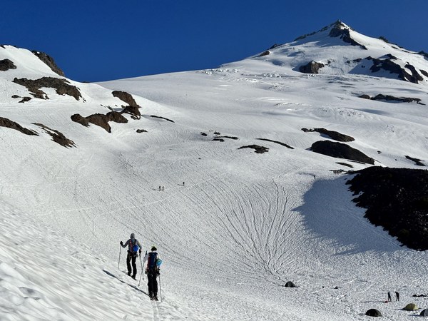 - Booting: Skis on packs and boot crampons on at crater rim to boot up Roman Wall