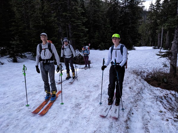 - Booting: Skis on packs at 3650' intermittent snow in the trees