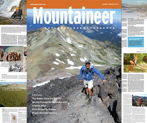 In this edition we explore the theme of "active aging," with members from our community sharing what it means to them to get outside and stay fit. In Moving Through the Mountains at 67, Piolet d’Or winner Steve Swenson and UphillAthlete founder Scott Johnston provide resources for building a training program as an older mountain athlete. In A Family Affair we meet Billee and Jack Brown, a couple in their late 80s whose lives have been spent surrounded by family in the outdoors, and in The Meadow, 38-year member Michael Shurgot shares an alarming wildlife encounter on a solo hike in the Canadian wilderness. In From Student to Teacher, we hear about Kiana Ehsani, and what it was like for her as an experienced climber from Iran to join our community. Mountaineers Books author and famed PCT trail angel Barney Scout Mann dives into the past with us in The Hidden History of the PCT, sharing an illuminating discovery he made in our archives about the inception of the trail.