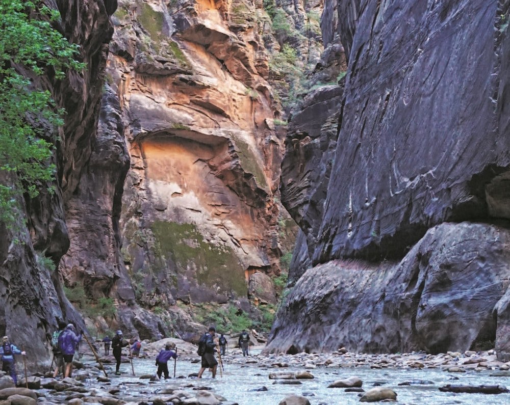 Zion’s other hallmark hiking route penetrates the narrow confines of Zion Canyon, where sheer cliffs rise directly from the banks of the Virgin River. This quintessential, showstopping Zion hike follows the course of the Virgin River, often within the river itself, through a twisting, turning section of Zion Canyon that’s often little more than 30 feet (10 m) across. When you aren’t negotiating the river’s current and the rocky riverbed, you will find yourself staring slack-jawed and in complete awe at towering sandstone cliffs rising hundreds, sometimes thousands of feet directly overhead.