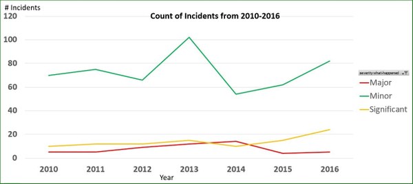 Incident Severity Chart 2010-2016 Multi-line chart comparing Major, Significant, and Minor incidents for years 2010 thru 2016 Click to view full-size image… Size: 122.9 KB