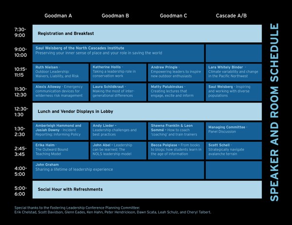 On Saturday December 5th at our Program Center in Seattle, The Mountaineers will hold a one-day conference on leadership skill development with engaging and dynamic speakers that will help you enhance your own leadership abilities within our programs (and the outdoor industry at large). Registration will start at 7:30 AM and our opening keynote will begin the program at 9:00 AM.