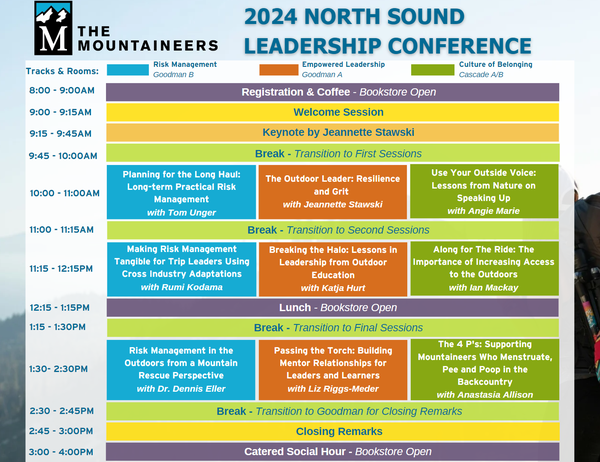 The Mountaineers North Sound Leadership Conference is a one-day conference at the Seattle Program Center in Magnuson Park. The program includes both esteemed outdoor professionals and seasoned leaders from our own community at The Mountaineers. A series of interactive sessions will explore the many facets of leadership – from servant leadership to risk management through the lens of justice, equity, diversity, and inclusion principles, to understanding leadership halos, and more.