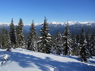 Cow Heaven is a strenuous snowshoe hike with 4,000 ft in elevation gain over 5 miles one way. The trail follows a creek up through forests and steep switchbacks. Scramble the southern ridge from Cow Heaven to reach Helen Buttes.