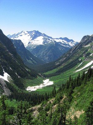 Follow the Easy Pass Trail up and over easy pass and descend into Fisher Creek Basin. Camp at Fisher Camp. The east side trail is well graded and a very easy ascent, on the west side it drops quickly into the basin on a steep and heavily switch backed trail. The ascent starts off with a stroll through a dense forest, a very nice bridge crossing and a number of very well constructed foot bridges elevating the hiker over mudded areas. At about 5,500 ft the forest ends and opens into flowering meadows with a good view of the pass. There is little shade left at this point until the bottom of the basin on the other side of the pass. Ascend the trail through a few boulder fields. At 6,500 ft, you'll be at the pass. Astounding views to the west of glacial peaks and into the basin with a few larch trees for fall colors as well.