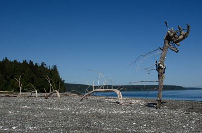 Hike north on the beach on the west side of Bywater Bay when there's a "minus tide" to prevent getting your feet wet crossing the channel connecting the west and east lobes of Bywater Bay or hike the long detour around the west lobe. Point Hannon (aka Whiskey Spit) on the northeast corner of Hood Head features open vistas to the San Juans and the infamous driftwood dragon.