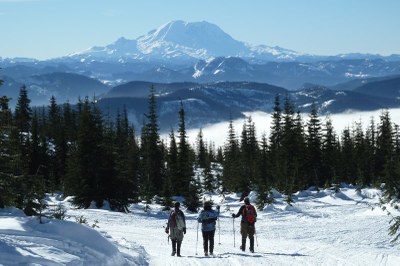 A moderate snowshoe or ski trip up to a hill with a former radio tower and views of Lake Keechelus and Mount Rainier. Route options include taking Forest Service Road 4832 to Forest Service Road 124 to the top, or bushwhacking more directly to either Microwave Hill or the true summit from Road 124.