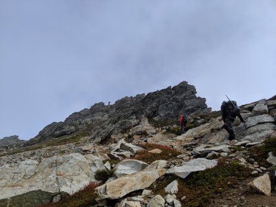 Hike the Glacier Basin Trail to 4,500 ft, where there is a large boulder (15 ft high). When the boulder is found, go left to another large boulder (20 ft high) across the basin and ascend small gully until 25 ft below a head wall. Then traverse left on rock ledges and up to trees/brush. Here a path that leads up to the left and to the ridge can be found. Follow path through scrub trees/brush to the ridge. Continue on ridge to about 6,800 ft, then go left across slope to the less steep slope west of the summit and ascend to summit.