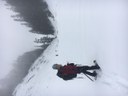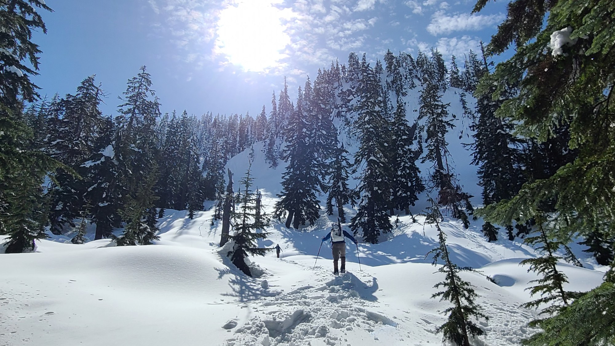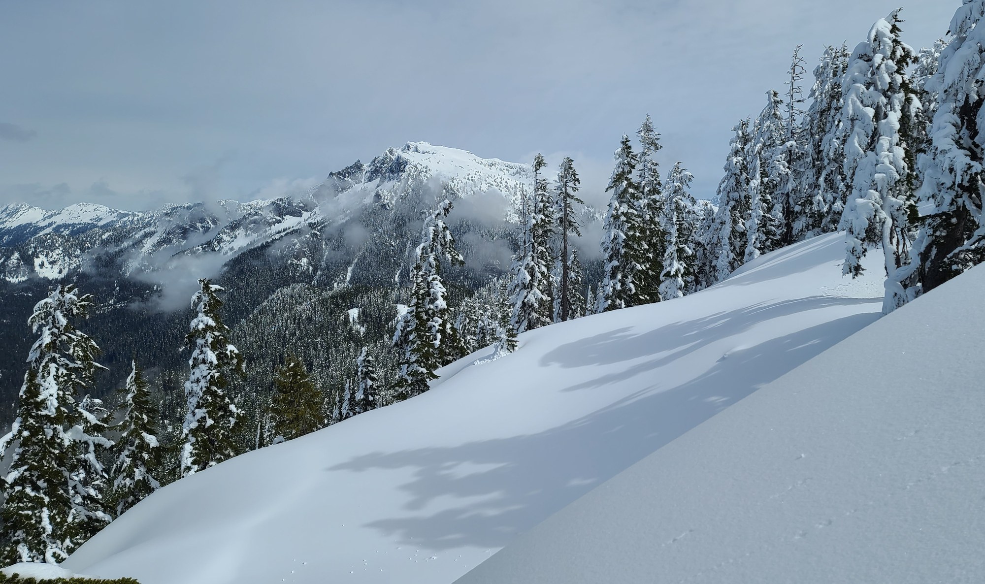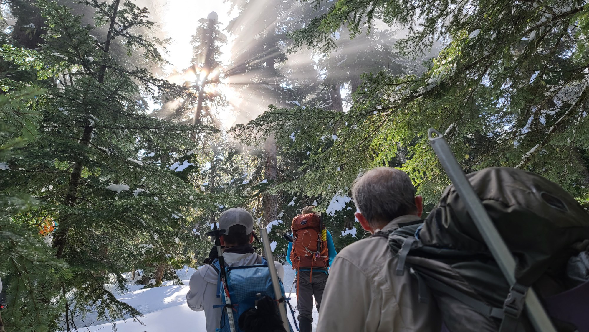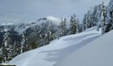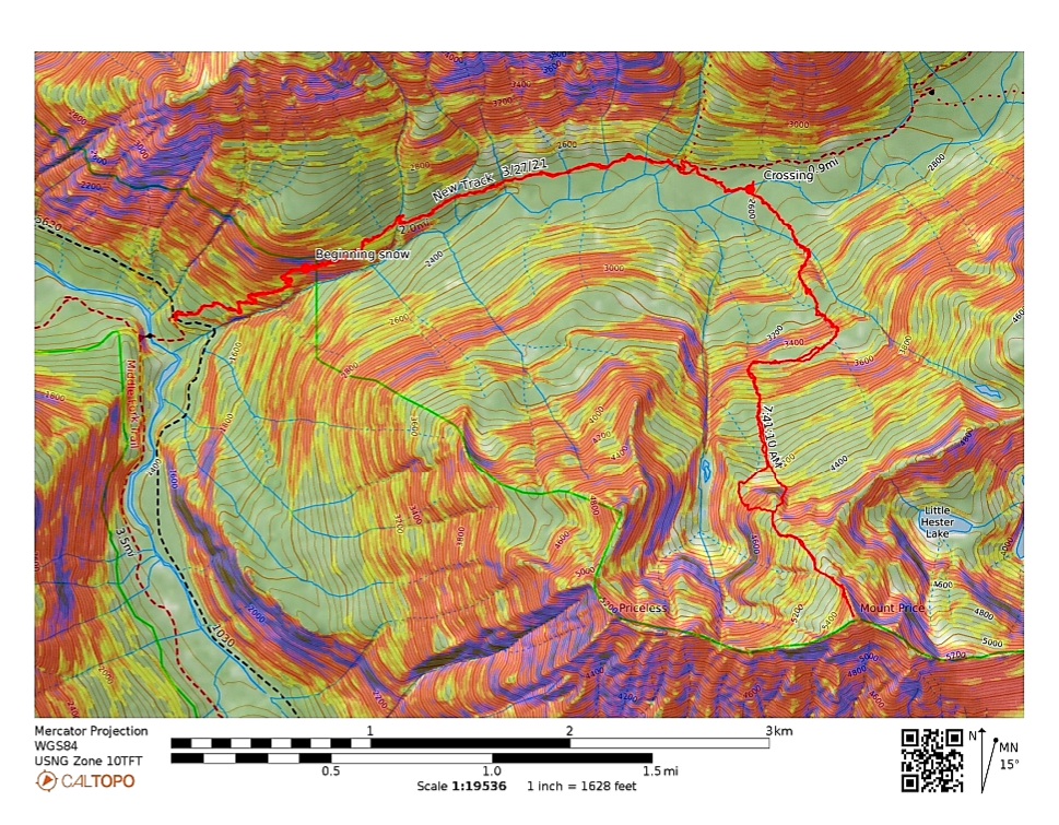 This is a view of Mount Price looking from the north (summit of Sorcery Peak). The three numbered circles show the route options. (1) is the gully above Price Lake that worked very well for David Jusish in 2017. (2) is the ridge east of Price Lake that was their second choice. (3) is the saddle northwest of Little Hester Lake that Mike Torok took in the 90's.