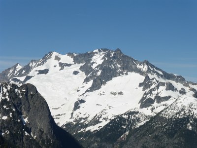 Ascend a snow gully or scramble rocks to attain the glacier. Climb the glacier to the col (steep at top). Ascend the 3rd-4th class summit block using the standard route.