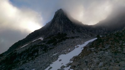 Head steeply up following good tape for about 4,000 feet in a couple of miles. At 6,000 ft you should be in a basin with the spire above you and camping to the right at about 6,500 ft and across the talus.