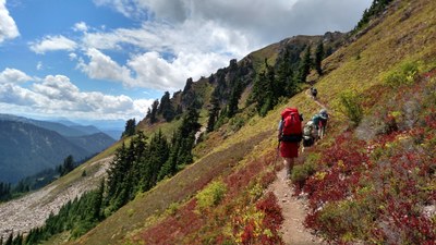 From Blue Lake, make a long traverse to the west, then wind back east. In 1 mile from the lake, a boot path heads a short distance to the top of 6,721-foot Johnson Mountain. For the next 4.5 miles the trail traverses Pilot Ridge along meadows with great views, into and back out of forest, up and down humps and dips, before committing to a steady steep drop in forest back to the North Fork Sauk River trail 9 miles from Blue Lake. Just before rejoining the North Fork Sauk river trail, it is necessary to negotiate a tangle of flood debris and cross the river on large logs. Once reaching the North Fork Sauk River trail, it is a straightforward 1.9 mile walk through old growth forest back to the trailhead.