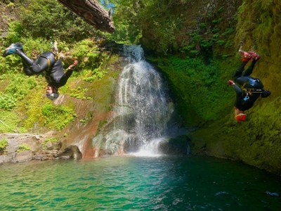 A short, sunny and scenic canyon with six rappels and four jumps. Highlights include a 35-foot jump from a diving board log into a deep pool and Pin Creek Falls, a popular destination for waterfall photographers. This canyon is typically run from July through September when it is rated v3a3 II.