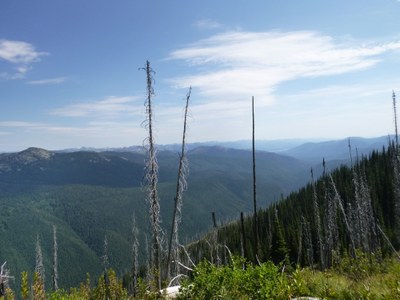 The fire lookout burned down several years ago but the site where it stood is a pleasant spot in the shade of gnarled trees for lunch or a short stop while hiking the Salmo-Priest Loop or Shedroof Divide. From the Shedroof Divide Trail, ~1.5 miles south of Snowy Top Pass, hike the Little Snowy Top Mountain Trail to the fire lookout site, 0.5 mile and 500 feet of elevation gain.