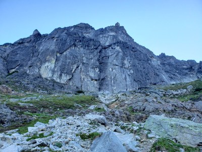Hike the Bedal Creek Trail (No. 705) for 2.5 miles along Bedal Creek, first through old-growth forest and then along Bedal Creek's steep banks. When the trail enters meadows beneath the west face, traverse up and right, crossing over the grassy shoulder that divides the west and southwest faces. Look for the chimney with lighter rock on the left, and darker to the right and the fairly obvious line on the southwest face, near the far right side of the wall.