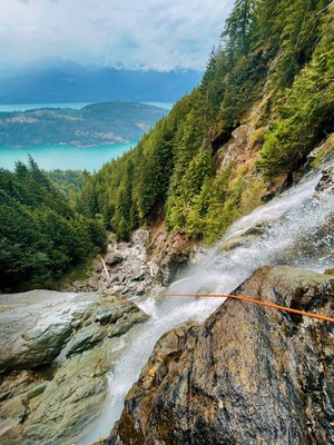 Nestled in steep peaks high above Harrison Lake, this creek is special for its gorgeous views and stunning verticality, at one point dropping 400 m in height over 480 m of horizontal distance. It has waterfalls 100, 90, and 80 m tall that have been pitched out with multiple rebelays. This highly technical descent is rated v5a4 from mid-August through September. It would be a fun challenge for well-trained teams who can efficiently manage hanging rebelays and the elevated rigging and rope management challenges that come with them.