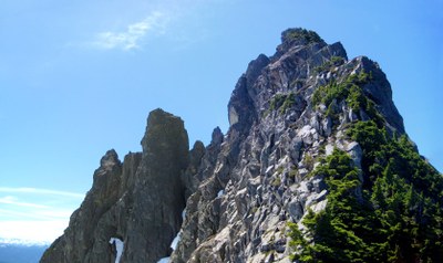This 6,213-foot summit is one of the least-often climbed of the Everett Pin Peaks. A cross-country route directly from the North Fork Skykomish River Valley reaches the north side of the peak. The final west ridge is mostly Class 3 with short stretches of Class 4 and 5 where a rope may be desired.