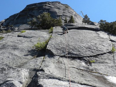 Pitch #4 - 5.7, 230 ft - This excellent pitch is long and varied. Climb the 3-inch crack then turn the corner to the left. Climb the chimney behind the flake, then climb directly up the middle of the face via a series of angling crack and flake systems. This pitch is very continuous. For a belay there are a few options: