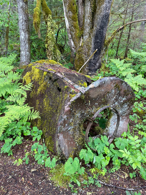 Hike the loop in either direction and enjoy the shady quiet of large trees and leafy vegetation. The loop is a "lollipop" with a short section of extra wide trail you'll hike regardless of whether you opt to go clockwise or counterclockwise. The trail does include a short stretch of a service road, perhaps 100-200 yards; this is signed and you'll stay near the fence. If you decided to go clockwise, you'll be keeping to the left on this service road section and then soon reaching the "handle" of the lollipop. There is a wooden observation platform approximately halfway through the loop overlooking a brushy wetland. Not many views to be had here but the platform provides a nice place for a break. There are signs by some of the historic logging equipment explaining logging history as well as the trail's namesake job of "whistle punk." Although the WTA's entry for the Whistle Punk trail mentions a connector trail that bisects the loop, as of May 2024 this connector trail has been abandoned and is unmaintained. An outhouse is available at the parking lot.