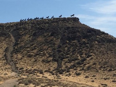 A short one mile round trip hike up a loose rocky scramble trail to a bluff that overlooks the Columbia River and features 15 wild horse metal sculptures, known as Grandfather Cuts Loose the Ponies.