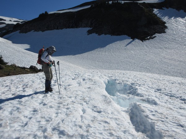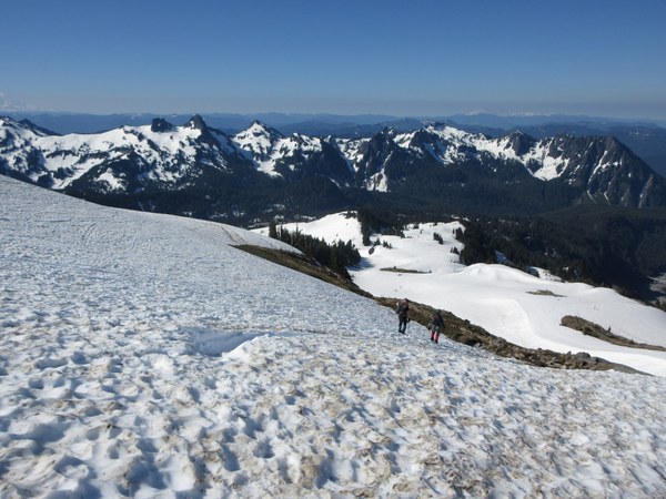 Lots of snow still around Paradise, but I was surprised at how much has already melted out above Alta Vista area. The chute up to Panorama Pt was partially melted, icy, probably rock fall hazard. But Pebble Creek trail was doable with intermittent snow stretches. There were several cracks opening in deep snow along the Glacier Vista ridge and water running under the snow in the big dip east of the ridge, we stayed high. The moon rocks were all out. Very few heading up to Muir, a couple of campers on the north end of Anvil Rock. Excellent plunge-stepping conditions, just a few icy spots under soft snow on the upper slopes, several short glissades with visible runouts. The snow is melting fast!