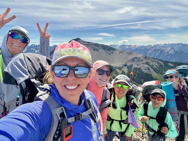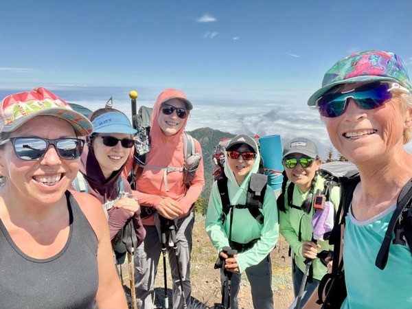We eventually broke out of the trees and were treated to flower-filled meadows and views in all directions. There was a nice breeze that kept us cool. The Tyler Peak trail ends just underneath Peak B. We continued on a bootpath toward Tyler Peak, taking turns leading. We summited Tyler before 1 PM and had a nice long lunch break. This was the third scramble trip for one of the students, so we celebrated her meeting her scramble requirements for graduation!