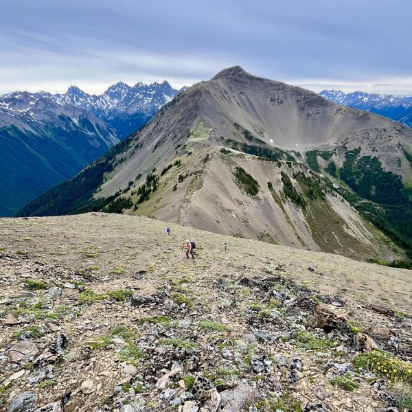 After Baldy, the trail ends and there is a steep and loose scree/rocky slope that we descended to the southwest. We spread out and put on helmets to try to avoid rockfall hazards. Everybody did great, and before we knew it, we were ascending yet again, up to an unnamed peak at 6526’.