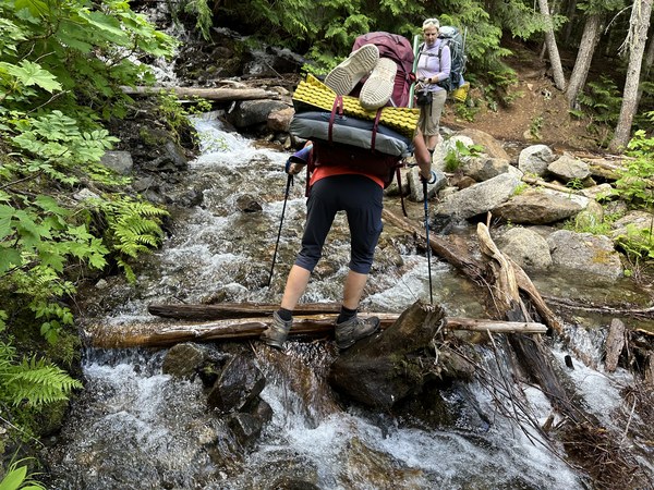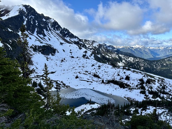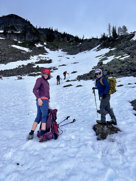 Met in Monroe at 7 AM and started hiking around 8:45. Road in great shape. Trail to turn off to Big Chiwaukum snow free and in good shape. Had thought about adding snowgrass, but it was around 3 by the time we arrived to the turn off to Big Chiwaukum so decided to take it more leisurely. Had originally planned to camp at Grace lake, but couple on the way up told us it was surrounded by snow and difficult to find running water. Found a camp before the ridge with running water and semi flat camp sites which also saved us some elevation gain/loss. Route to camp was relatively straightforward, but definitely helpful to have a GPX track to get through some of the steep areas. No real bootpath except at very beginning and not much snow. 3361 gain and 7.65 miles on first day. Biggest problem was a few dicey water crossings but all managed with rocks/logs/ or a bit of searching.