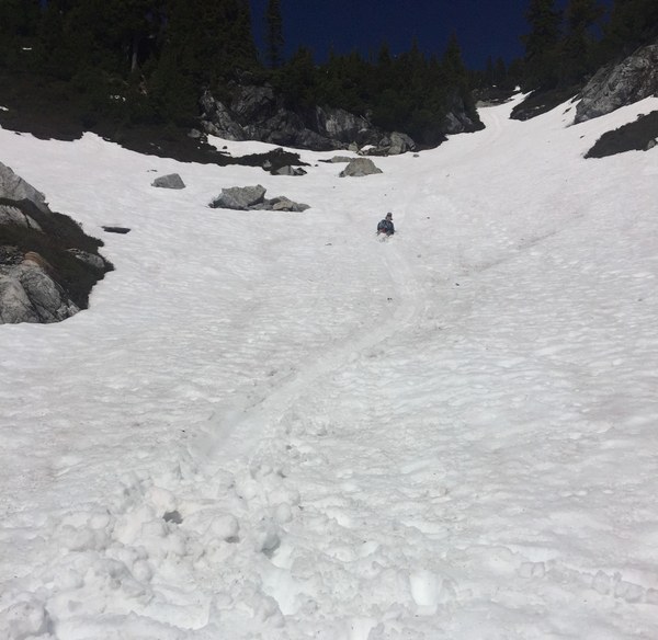 After a late lunch on the summit we headed down the ridge to the low point before the false summit and then drop to Sunup Lake.