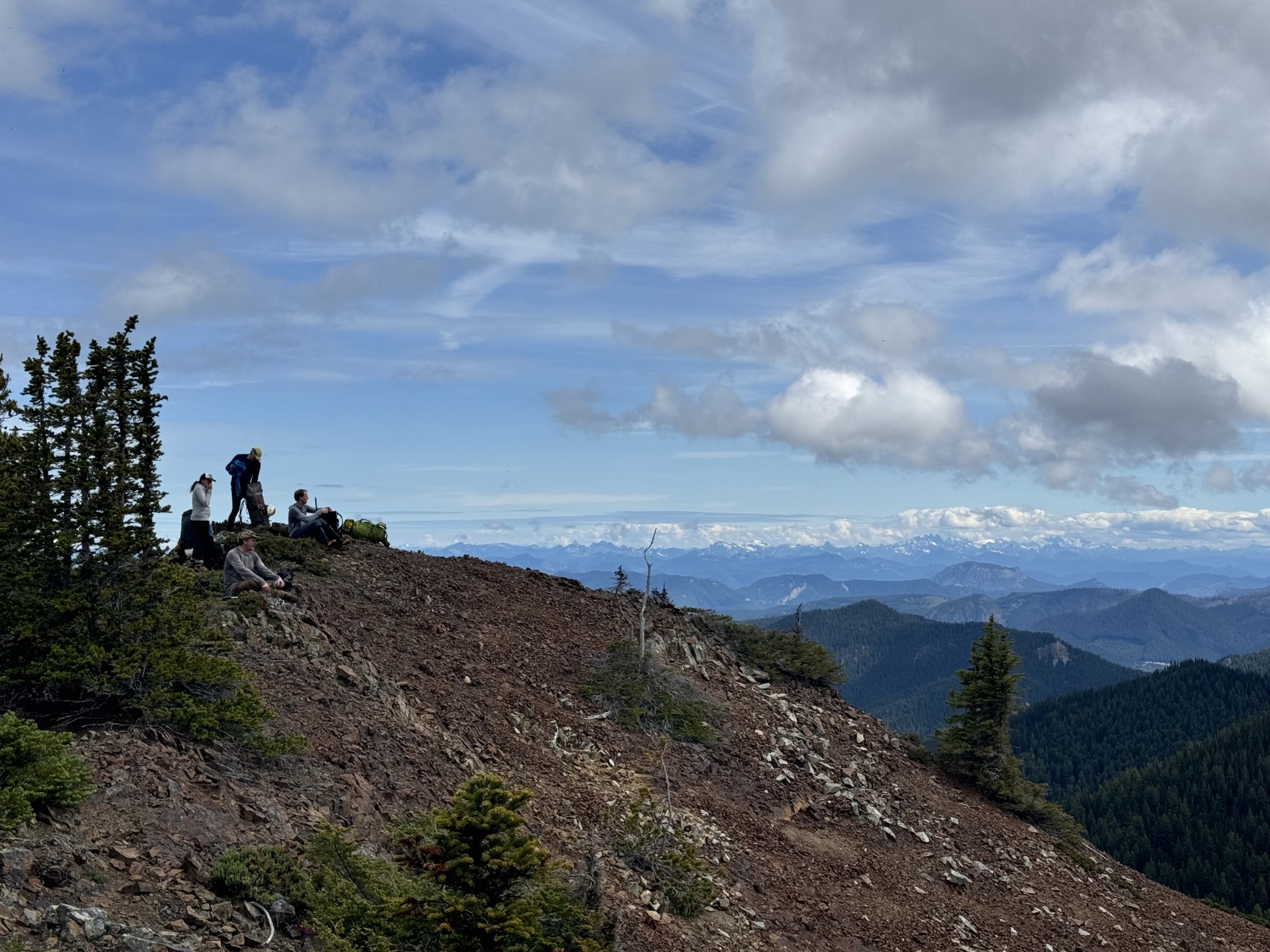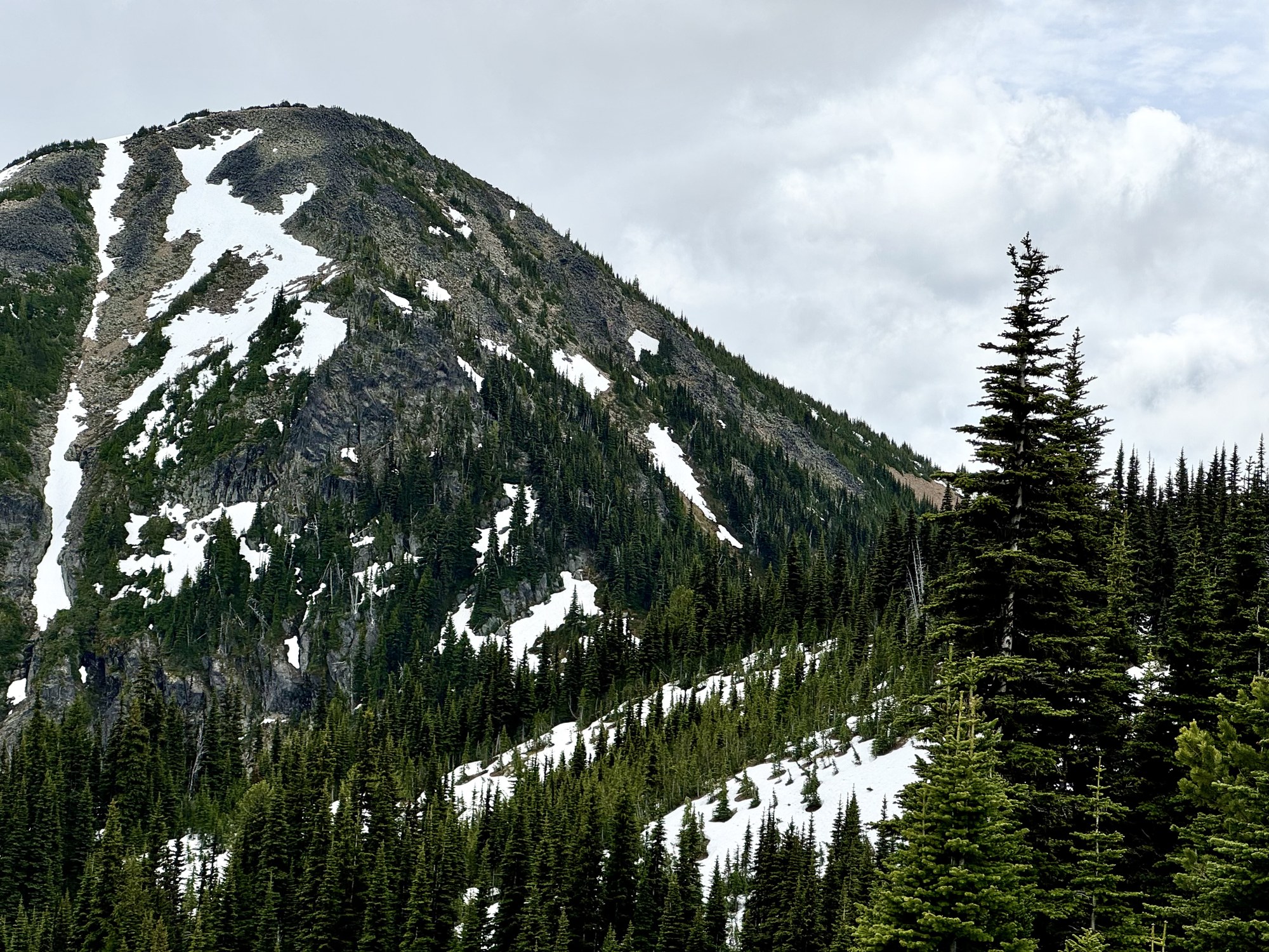 After a relatively short drive from the lowlands we were soon hiking the Huckleberry Creek Trail. The park service has greatly improved this trail’s initial swampy section with a higher/dryer segment. That said, the winter storms have not been kind with a number of old growth giants toppled across the trail. In spite of these delays we departed the trail near 46.97588°N 121.63551°W and after a bit of brush down low were soon on Burnt Park’s western summit (Point 6327).