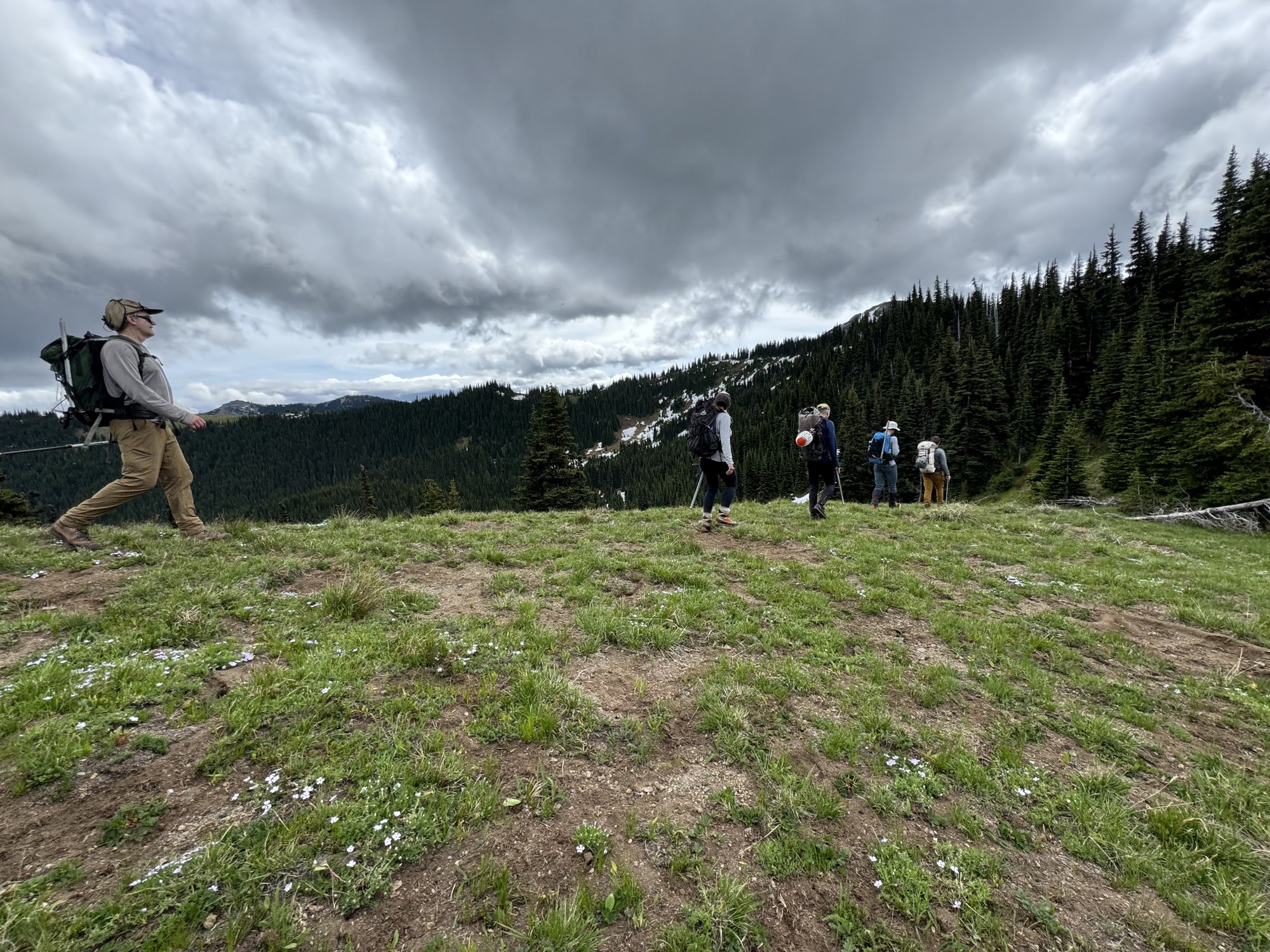 From Burnt Park’s eastern summit (Point 6358) you can see the inviting snow-free meadows of Grand Park, yet lots of snow still present near Sunrise.