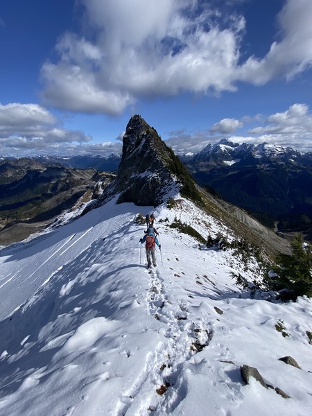 We were relieved to see just light traces of snow on the Pinnacle, which could have been challenging to climb with a thin layer of snow covering the rock. Leaving the trail, we ascended the south ridge and traversed the saddle towards the pinnacle.