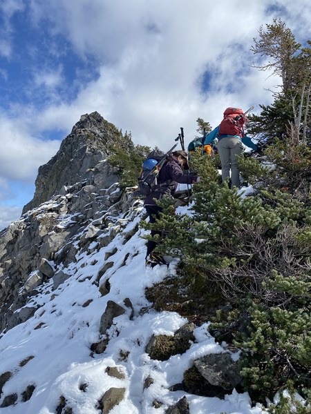 The crux of the climb was completely unexpected: a tight stretch of trees, aka “the tree problem”, that we had to fight through to reach the pinnacle. The usual route bypasses these trees by dropping down the slope climber’s left, but a thin layer of snow covered the rocks with bad consequences for a slip, making the usual route treacherous in the current conditions.