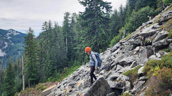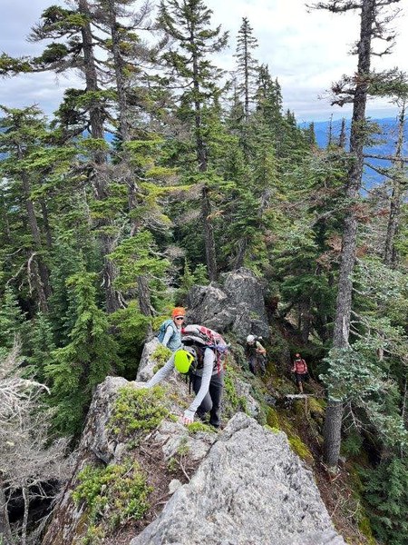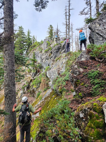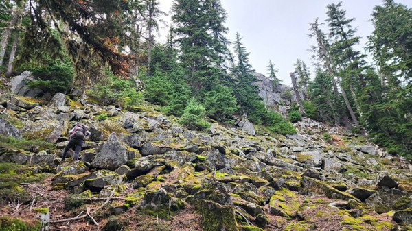 Once we were all down, we attempted to stay close to the ridge, but it quickly became apparent we couldn't. I am not sure if we went the best way, but we had to drop below cliffs into brush several times only to have to climb back up. At one point we dropped about 400' and reclimbed it soon after. Not a lot of views to be had since we were mostly in the trees and brush, but we did come across this boulder field which offered a view.
