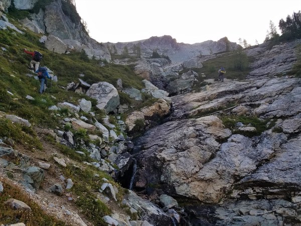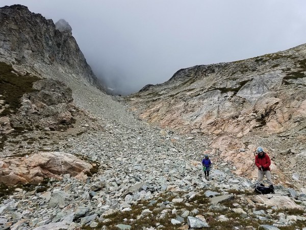 Back across the snowfield, ledge, to the notch, down the chossy gully, heather benches and slabs to our tents.