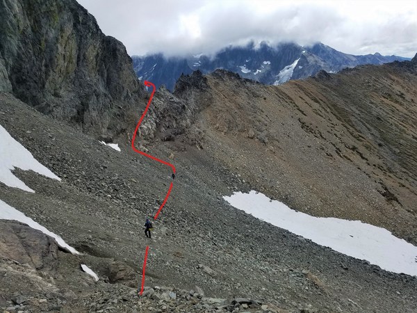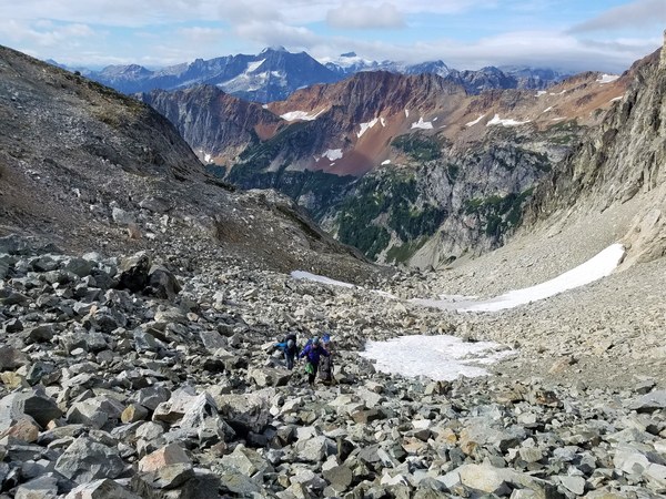 Time to descend and head to Greenwood Mtn. We retrace our route. Down the chimney and across the chossy gully to the notch.