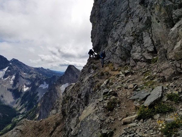 The traverse around the ledge is not difficult unless you have exposure problems. Good handholds available. Greenwood Mtn is in the clouds.