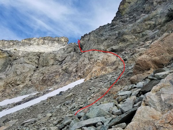 Then across a chossy ledge and up the chimney as shown in the photo below.