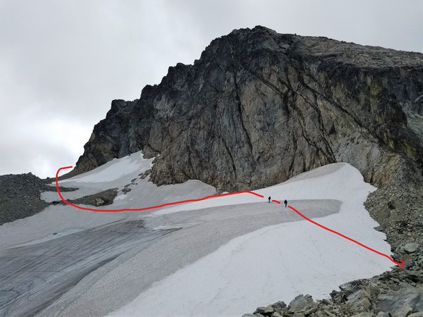 Once off the ledge,we put on our crampons and cross the snowfield. Microspikes would have been fine or even no traction as the snow was not icy. Summit of Dumbell above the people.