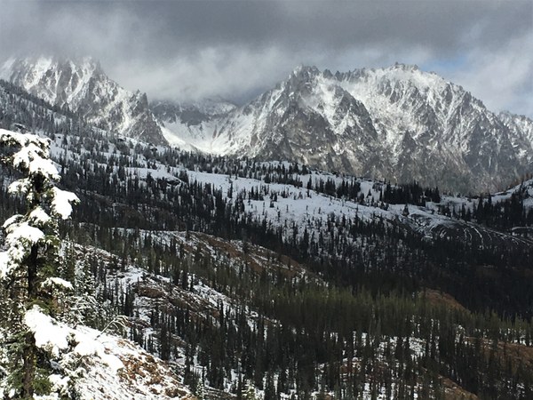 With a forecast of high winds, the goal was changed from Fortune to Pt 6549, a surveyed summit southeast of Earl Peak near the Standup Creek/Stafford Creek pass. This allowed for a wind protected approach. The Standup Creek trail had 5 stream crossing, fine now but might be difficult in high water. From the pass Earl is accessible by a less travelled route, as well as Pt 6549. Snow was continuous from ~5,800'.