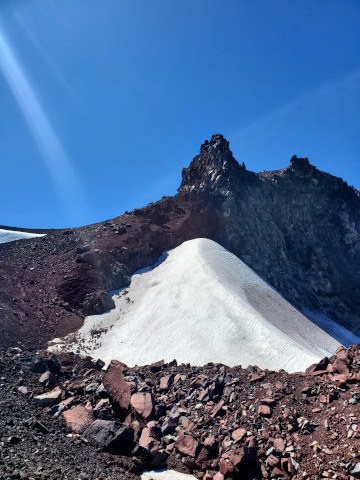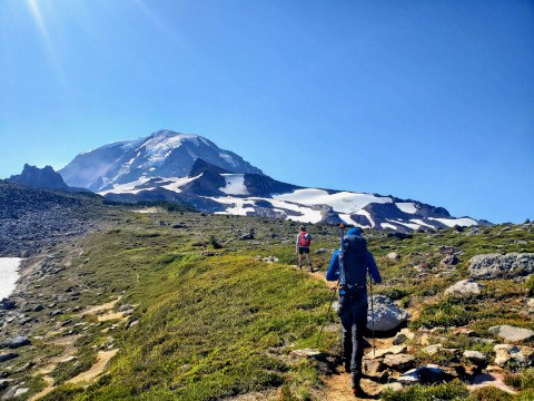 Past the pass we crossed some small snow fields to get to the junction with Spray Park Trail.