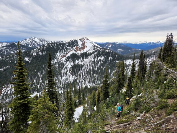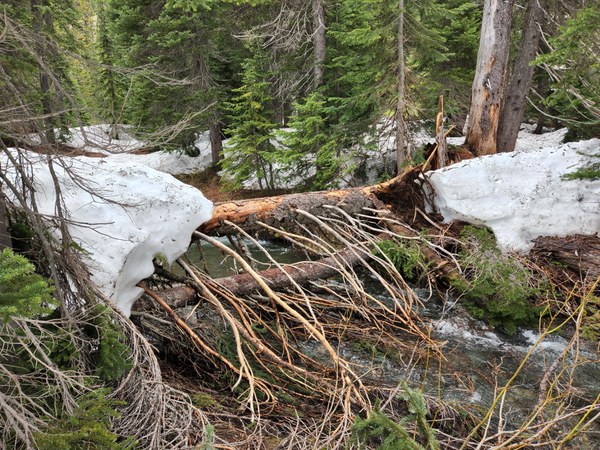 We met up at the DeRoux trailhead and began hiking out the DeRoux Trail just before 9AM. We counted 34 blowdowns, that we had to step over or detour around, within the first 2 miles of the trail hike. The blowdowns are spaced apart, but slowed our pace a bit on an otherwise easy entry to the scramble. Inconsistent snow started to appear on the trail about 4,800 feet or 1,000 feet of gain up from the trailhead. Shortly thereafter (just above 5000 feet), we encountered a narrow section of snow-covered trail with a sharp drop off down to the DeRoux Creek below. We stopped to get out our ice axes and helmets before proceeding. We used both for the remainder of the trip until we descended back past this point on our return. No other equipment was needed (no traction/flotation).