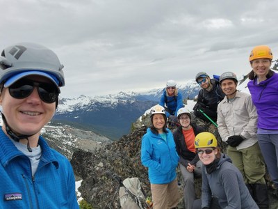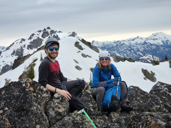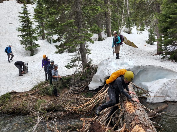 After a 20 minute summit break to refuel and take photos, we started to head back down. The snow was perfect for plunge stepping all the way back down the basin. A few participants wanted to glissade to get additional experience, so Rena and I identified a safe slope and we were able to get in two nice glissade runs (making our own chutes) back down to the bottom of the basin. From there it was an uneventful descent back to and across the creek. Then finally the "blowdown" hike back to the trailhead. On this day the route seemed to really give us a true scrambling experience with so many skills used and some great experiences for participants (save from true rock scrambling). We were very fortunate the weather held out and the good views were delivered too! Thanks to such a fun, positive, and supportive group - Annie, Anita, Ben, Daryl, Gaby, Rena, and Shauna - for making it a successful scramble!