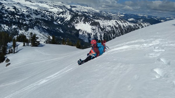 After a lunch break, we descended the same way we came up. The final 100 foot section was a little icy, so we could not plunge step, but using our self belay skills, we slowly descended back to a safer location. We were then able to glissade the rest of the way down to just above the 5,950 lake and then ascended our ridge line back to where we captured the ridge near the Castle.