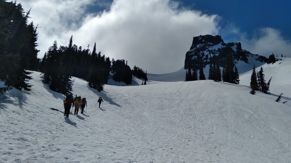 We then glissaded from the saddle in sections almost all the way down to the trailhead. Our final glissade from 5,560 down to 5,200 feet was epic. The snow was soft enough where we were able to get some good speed without being unsafe. At the road, we walked back to the Narada wall. I glissaded down to the parking lot, though a couple of our scramblers were pretty tired, so they just walked the road over to the trail connecting Narada Falls and Paradise.