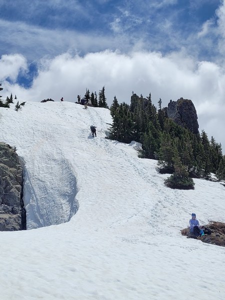 Road is open to Reflection Lakes. Snow was nice and firm for our ascent, slippery and soft for our descent. Our planned glissade route is starting to melt out, so we had to descend the final 500 feet the way we came up