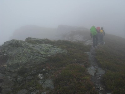 Had cloudy weather in the morning with swirling mists; quite beautiful. Blueberries were ripe & plentiful. The mist turned to rain, making the climber's trail quite slippery. Upon reaching the false summit, we had cold rain, wind & poor visibility, so elected to not even try for the true summit.