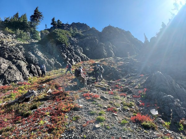 After snacks and photos, we descended the exact way we came up and met our 8th scrambler in the field below the ridge. We continued south along the east side of Governor's Ridge and Barrier Peak careful not to descend too low. There was plenty of vegetation including huckleberries along the way. We then turned southwest and scrambled up to the Buell/Barrier ridge and on to the base of the Barrier Summit Block. The rest of the way up Barrier Peak is all T2 and easily achieved. Our summit of Barrier was at 4:30.