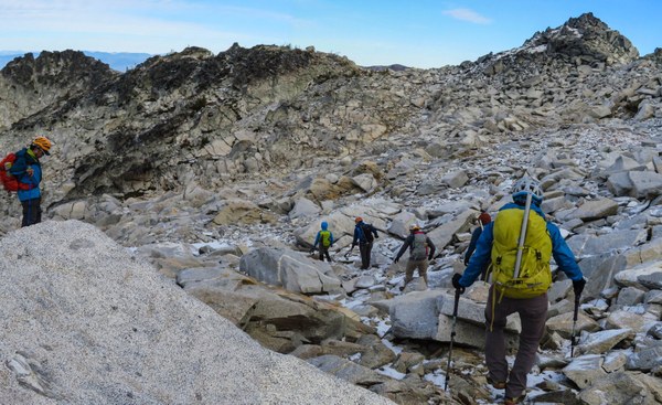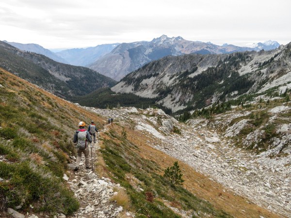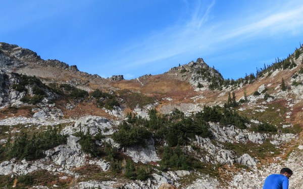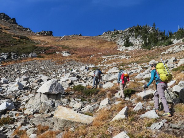 Heading off trail towards the saddle. The weather and views are great.