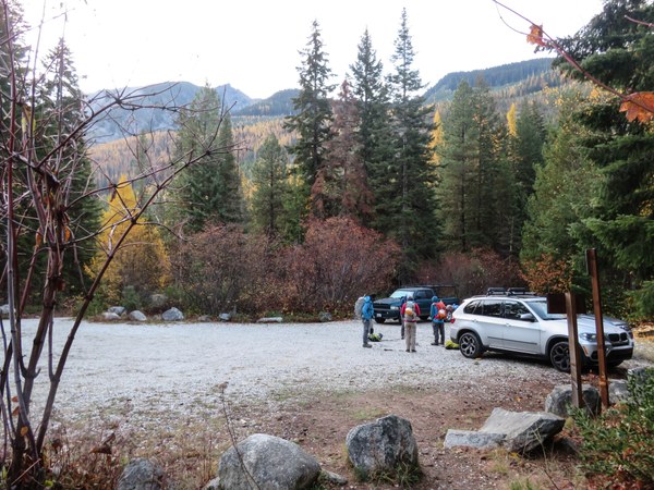 Eight of us met a Tibbets P&R in Issaquah at 5:30am and made it to the TH at 8am with no stops along the way. We left the TH at about 8:15am on a nippy, but lovely morning. The trail is in good shape with what we believe were rangers, who were just there a few days before trimming back the brush. We are under the trees for at least the first 3rd of the hike in and pass by a couple good size campgrounds. One is occupied by 4-5 men drinking beer under a tarp with a fire burning in the firepit at 9am. When we return, we notice they have left the campsite spotless.